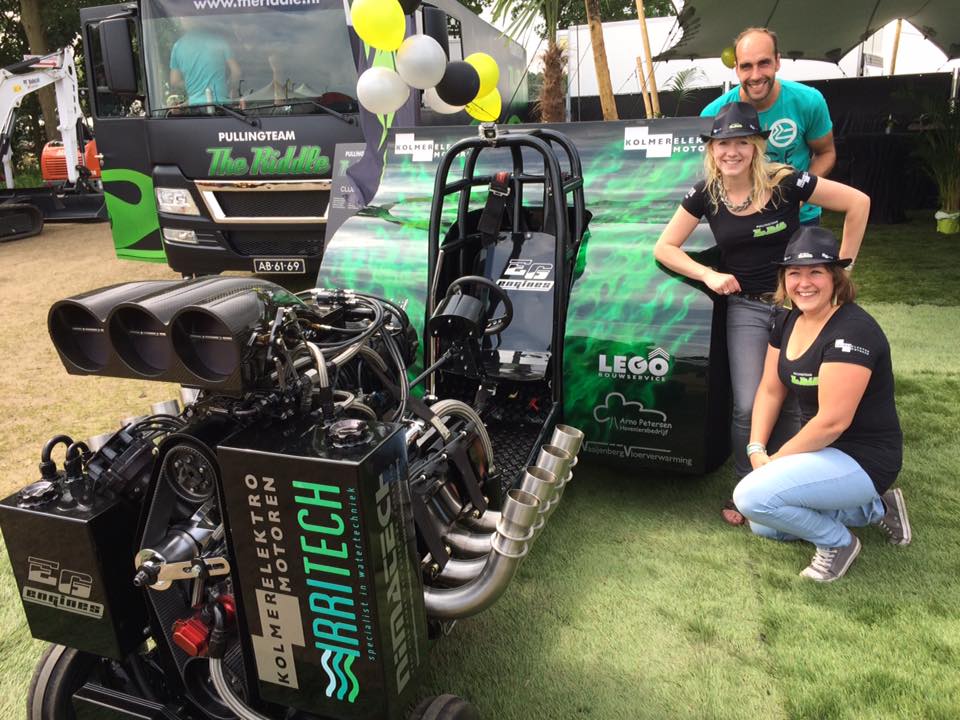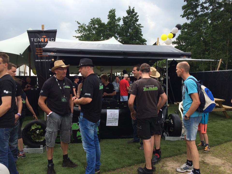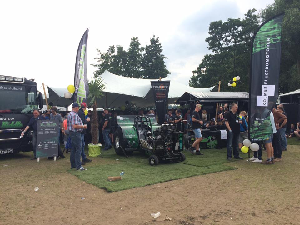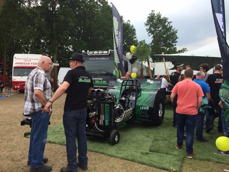 Rond de klok van 15:00 stroomden de bezoekers binnen, de Riddle tent stond al snel gezellig vol. Vanaf 17:00 werden onze gasten voorzien van een warm- en koud buffet. En onder het genot van een Riddle drankje hing er een gezellig sfeer! Tot dusver was de dag dus geslaagd! Maar vanaf 19:30 uur begon het dan echt spannend te worden aangezien de mini-unlimiteds dan van start gingen! Met drie proeftracks in onze klasse werd uiteindelijk de afstelling bepaalt. De eerste officiele run was voor Total Exception en met een mooie stabiele run eindigde deze bij een afstand van 102,52 meter, Hierna was het de beurt aan Vampire en eveneens met een snoieharde stabiele en rechte run moest hij over de 110 meter van zijn gas! Hierna mochten wij aanhaken. Bij The Riddle verliep de run niet ''vanzelf'' en al dansend mochten wij ons gelukkig ook tot de finalisten voegen! Wat een reacties uit het publiek wanneer we langs hen heen weg gesleept worden! Echt super!! Iedereen leeft echt mee en lijkt eveneens net zo blij te zijn als wij met deze full pull! Echt een bijzondere ervaring ieder jaar weer voor het eigen thuis publiek.